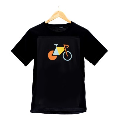 Camiseta negra fabricada en algodón 100% con estampado de bicicleta eléctrica de colores.