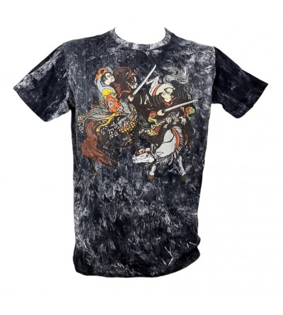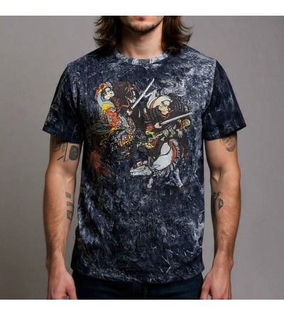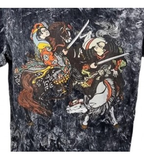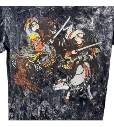Representa una escena de batalla o combate a caballo entre dos figuras samurái.