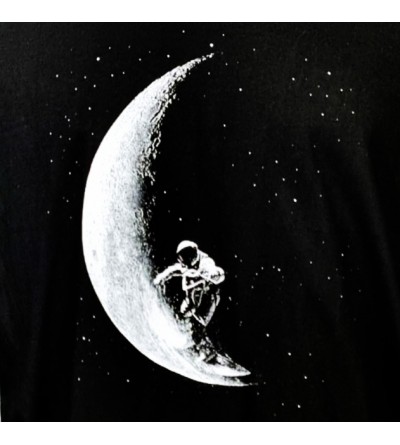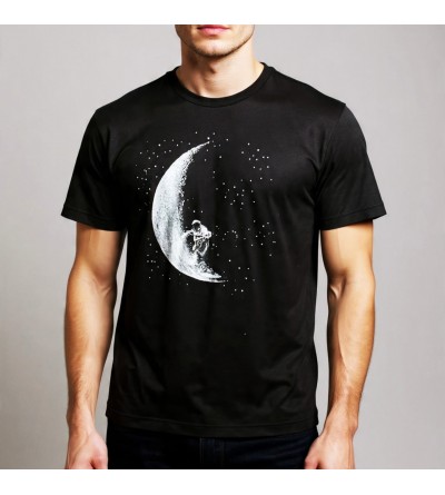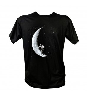 Camiseta negra con un diseño único de un astronauta surfeando la luna. Ideal para amantes del espacio, lo cósmico y la moda original. Suave, cómoda y perfecta para regalar.