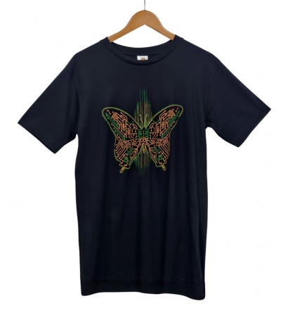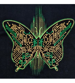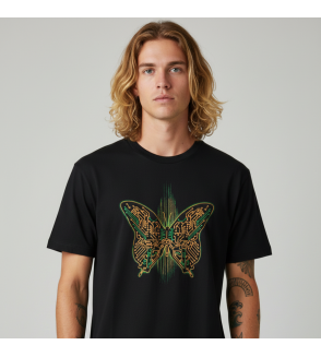 Camiseta negra con un diseño de mariposa formada por circuitos electrónicos en tonos verdes y naranjas, que mezcla estilo tecnológico y moderno con un toque futurista. Ideal para quienes aman la estética digital y los gráficos llamativos.