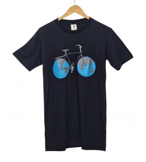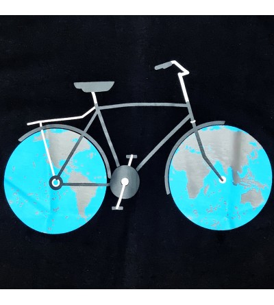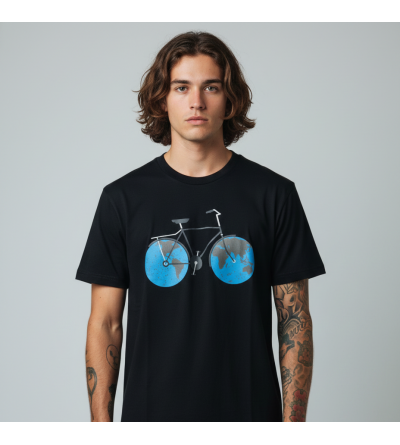 Las ruedas de la bicicleta están representadas como globos terráqueos, uno en tonos azules y otro en tonos grises, creando un efecto visual creativo y simbólico.