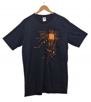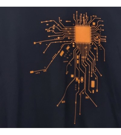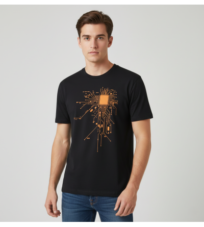 Camiseta negra de estilo moderno y minimalista, con un diseño gráfico inspirado en la tecnología y la electrónica. El estampado central simula un microchip del que se extienden circuitos, creando una imagen potente y contemporánea que destaca sobre el fondo oscuro.