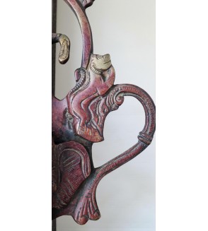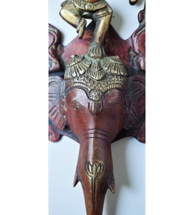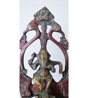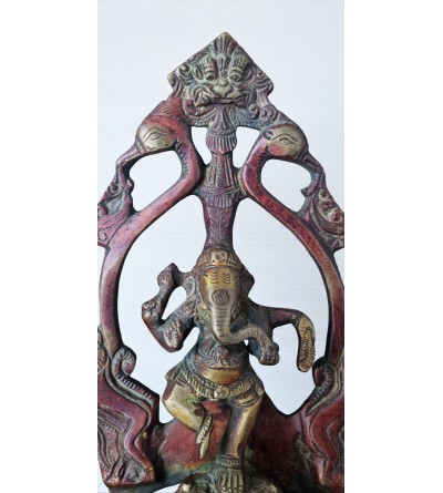 La figura de Ganesha está enmarcada por un hermoso diseño arqueado (un torana) y se encuentra sobre una detallada cabeza de elefante tallada. El elefante simboliza la sabiduría, la fuerza y la majestad.