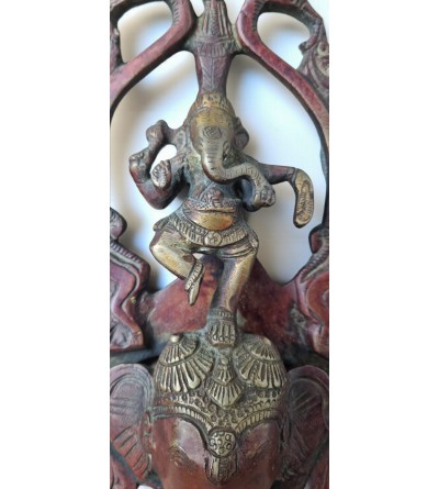 Debajo se encuentra una figura de Ganesha bailando,en la forma Nritya Ganesha, una pose que simboliza el júbilo y la energía artística. Ganesha es una figura central para traer buena suerte y bendiciones.