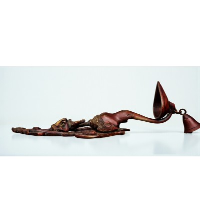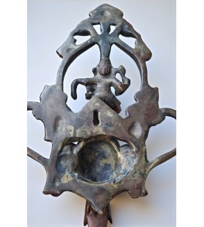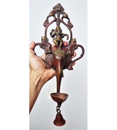 La pieza incluye una campana (ghanti) colgante debajo del cuenco de aceite, un elemento que se utiliza a menudo en rituales y que se cree que ahuyenta el mal.