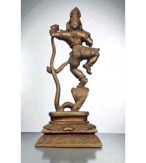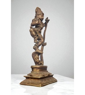 La figura está representada con una pierna levantada, como si estuviera danzando con gracia y ligereza sobre la cabeza de la serpiente. Esta pose no solo denota el baile, sino que también simboliza la victoria del bien sobre el mal.