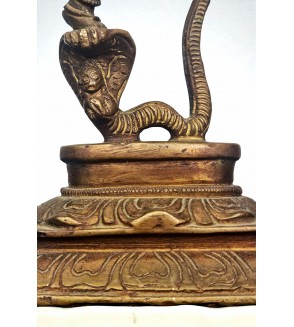 La serpiente se muestra con sus múltiples capuchas desplegadas, sirviendo de base para la figura de Krishna. La forma en que el cuerpo de la serpiente se eleva y envuelve a Krishna simboliza la lucha y la sumisión de Kaliya.