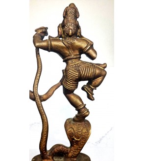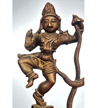Esta figura de latón es un tema icónico en la mitología hindú, especialmente en las tradiciones que giran en torno a Krishna, una de las deidades más importantes.