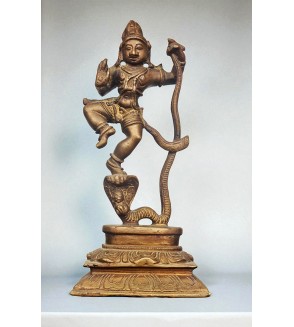 Cuando Krishna, aún de niño, vio el sufrimiento de la gente, saltó a las aguas contaminadas para enfrentar a la serpiente. Krishna subió sobre las múltiples cabezas de la serpiente y comenzó a bailar sobre ellas, ejerciendo su peso divino y su poder para someter a la criatura. Kaliya, derrotada y exhausta, finalmente se rindió y prometió abandonar el río para siempre, permitiendo que las aguas volvieran a ser puras y seguras.