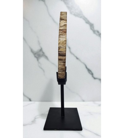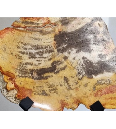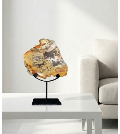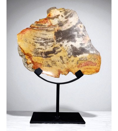 Rodaja de madera fosilizada procedente de la isla de Java en Indonesia y se originó en la era del Mioceno, entre 5 y 25 millones de años atrás. Los troncos de madera fosilizada surgen de un árbol real, que creció próximo a un volcán. Después de una erupción, estos árboles quedan enterrados en cenizas y tierra, y es a través de un proceso natural, para el que deben transcurrir millones de años, en el que los manantiales subterráneos convierten pacientemente la madera en piedra. Los troncos de madera se fosilizan mediante un proceso denominado permineralización, en el que tiene lugar la precipitación de minerales en los tejidos celulares vegetales. Con frecuencia es la sílice la que precipita, de forma que todo el material orgánico es reemplazado por este mineral. La fosilización ocurre bajo tierra, cuando la madera queda sepultada bajo condiciones de ausencia de oxígeno, lo que favorece su conservación. El agua rica en minerales se filtra y los deposita en las células del vegetal, de modo que al descomponerse la lignina y la celulosa, en su lugar se forma un molde transformado en sílice. El proceso de conservación de los restos fósiles en sílice recibe el nombre de silicificación.