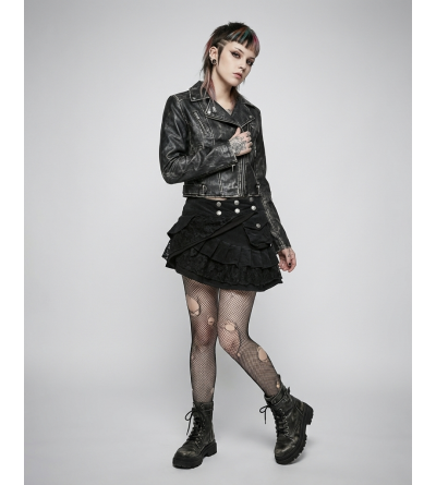 Su diseño presenta una silueta asimétrica con múltiples capas de volantes que aportan movimiento y volumen. La cintura ancha está decorada con botones plateados de estilo militar, mientras que el bolsillo lateral con solapa añade un toque utilitario y "grunge" al conjunto.