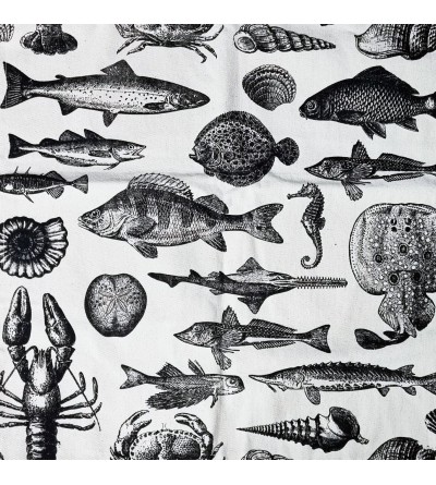 Esta es una ilustración maravillosa que muestra una variedad de animales marinos.La imagen es una ilustración en blanco y negro que presenta una variedad de animales marinos y elementos relacionados con el océano. Hay varios tipos de peces, cada uno con detalles intrincados que muestran las escamas, las aletas y otras características físicas. Un cangrejo con patas largas y pinzas prominentes se encuentra en la parte inferior de la imagen. También se incluyen un caballito de mar, un pulpo y varias especies de moluscos, todos detallados artísticamente. Los elementos están dispuestos al azar a lo largo del lienzo, creando una composición diversa y llena.