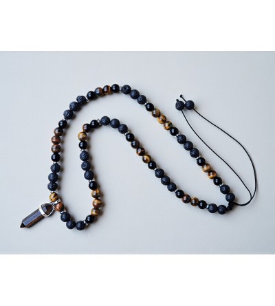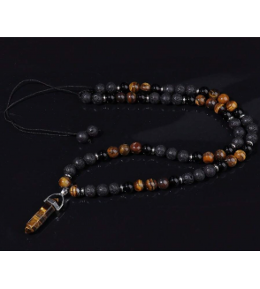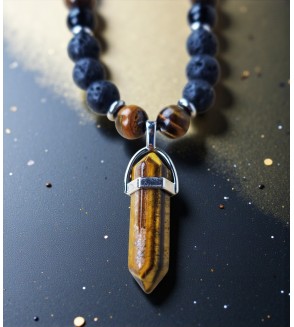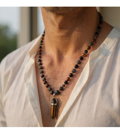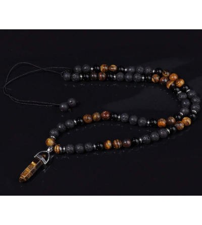 Collar de cuentas de piedra de lava, ojo de tigre y ónix negro con colgante punta de ojo de tigre.