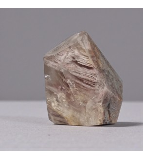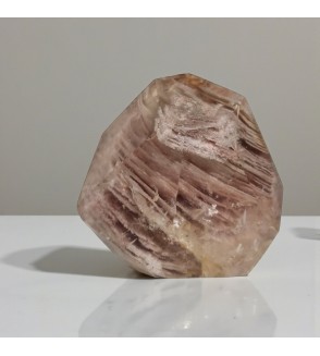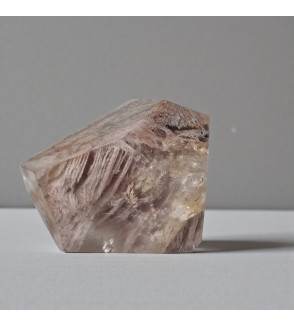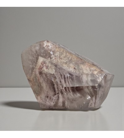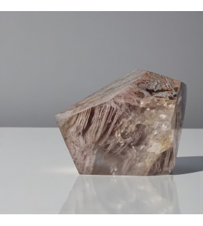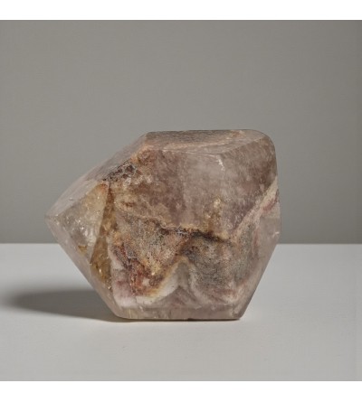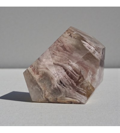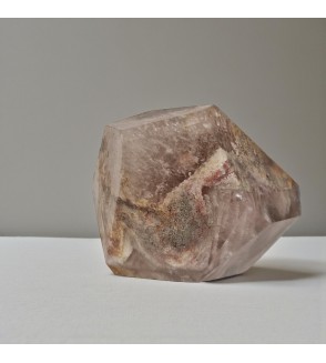 Pieza única de cuarzo lodolita natural de Brasil, tallada y pulida con 12 lados, que le confieren una geometría equilibrada y poco común, ideal para exhibición. Presenta transparencia parcial y abundantes inclusiones internas tipo paisaje, con formaciones naturales que evocan capas de tierra y sedimentos en tonos marrones, ocres y suaves matices rojizos, creando una profundidad visual distintiva.