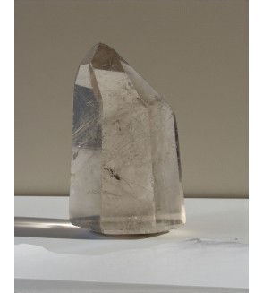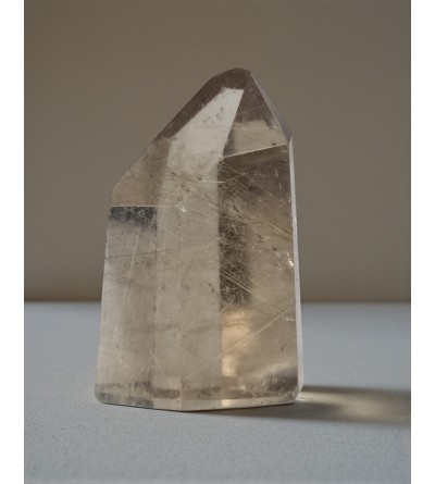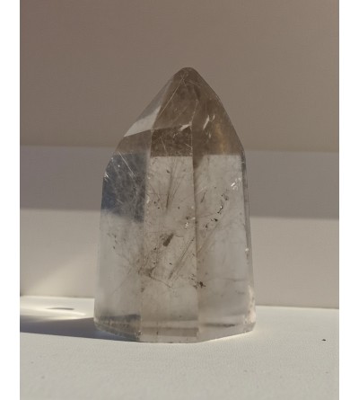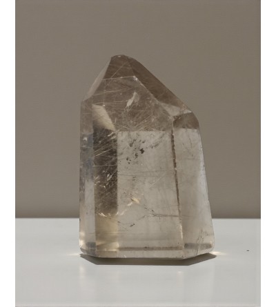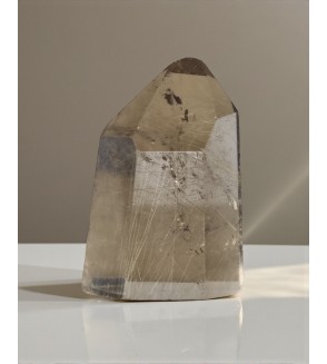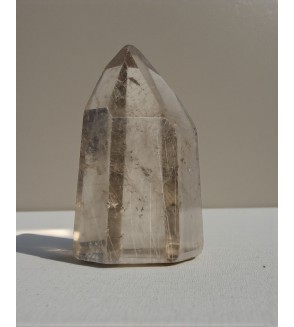 Punta de cuarzo natural de Brasil, con elegante tonalidad marrón‑gris translúcida y terminación bien definida. Su interior presenta velos y líneas internas naturales que aportan profundidad y carácter, reflejando los procesos geológicos que dieron origen al cristal.