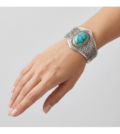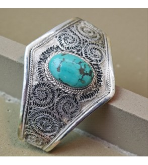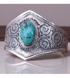 Esta elegante pulsera estilo tibetano está elaborada en Nepal con plata 925 y decorada con finos grabados en forma de espirales que realzan su carácter artesanal. En el centro destaca una piedra turquesa natural, de tonos azul verdoso con vetas únicas, símbolo de protección y energía positiva.