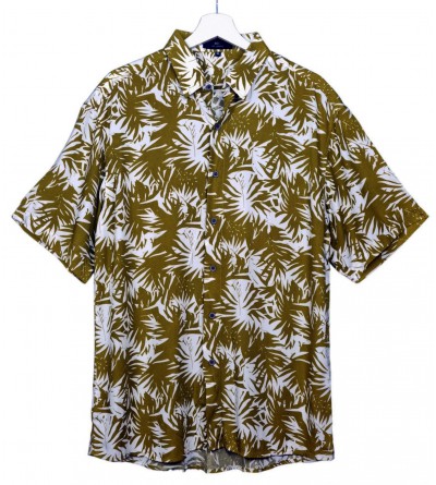 Camisa fabricada en tejhido de viscosa con estampado de hojas blancas sobre un fondo de color mostaza. Este diseño crea un patrón atractivo y naturalista. Es un estilo que puede ser muy apropiado para ocasiones casuales o para eventos al aire libre.